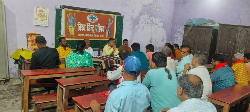 बलरामपुर।झारखंडी रेलवे स्टेशन के पास स्थित संस्कृत महाविद्यालय बलरामपुर में विश्व हिन्दू परिषद की जिला कार्यकारिणी की बैठक की गई जिसमें अवध प्रांत के प्रांत संगठन मंत्री विजय प्रताप सिंह का आगमन हुआ। बैठक में संगठन के विस्तार को लेकर जिले के सभी जिम्मेदार पदाधिकारी से चर्चा हुई एवं आगामी कार्यक्रम तय हुए 16 व 17 अक्टूबर को बलरामपुर जनपद में होने वाली जिला अभ्यास वर्ग पर चर्चा हुई एवं 9 नवंबर को होने वाले महाभारत एवं रामायण संस्कार परीक्षा व धर्म रक्षा निधि कार्यक्रम को सफलतापूर्वक संपन्न कराने का निर्णय सभी पदाधिकारियों ने लिया एवं जनवरी में होने वाले कुंभ मेले को लेकर भी चर्चा हुई। बैठक की अध्यक्षता जिला अध्यक्ष अजय श्रीवास्तव एवं संचालन जिला मंत्री दीपक चौधरी ने किया। उक्त अवसर पर विभाग मंत्री सुबीर श्रीवास्तव,जिला संयोजक सुरेश कश्यप,जिला सह मंत्री विजय शुक्ला,जिला उपाध्यक्ष रेशम दीदी,दुर्गा वाहिनी संयोजिका रीता शुक्ला, मातृ शक्ति संयोजिका किरण सिंह,जिला कोषाध्यक्ष संजय रस्तोगी ,प्रखंड अध्यक्ष रेहरा अजय तिवारी,प्रखंड मंत्री रेहरा संतोष सोनी,प्रखंड अध्यक्ष बलरामपुर नगर हर्षित सोनी,प्रखंड सह संयोजक बलरामपुर नगर राजकुमार ,प्रखंड संयोजक उतरौला नगर प्रखर गुप्ता,प्रखंड अध्यक्ष गैड़ास ओमकार,प्रखंड सह संयोजक गैड़ास संतोष कुमार,रोशन लाल, गैड़ास प्रखंड उपाध्यक्ष अजय कुमार,प्रखंड अध्यक्ष हरैया के के मिश्रा आदि मौजूद रहे।