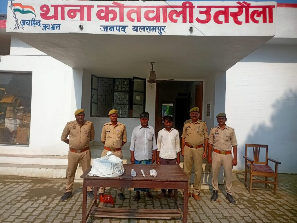 उतरौला,बलरामपुर।पुलिस अधीक्षक बलरामपुर विकास कुमार द्वारा अपराध एवं अपराधियों पर अंकुश लगाए जाने हेतु चलाए जा रहे अभियान के क्रम में अपर पुलिस अधीक्षक दक्षिणी श्रीमती नम्रिता श्रीवास्तव व क्षेत्राधिकारी उतरौला राघवेन्द्र सिंह के पर्यवेक्षण में तथा प्रभारी निरीक्षक थाना कोतवाली उतरौला के नेतृत्व मे आज दिनांक 20.10.2024 को थाना को0 उतरौला पुलिस टीम द्वारा मु0अ0सं0 221/24 धारा 3/5/8 गोवध निवारण अधिनियम से संबन्धित में प्रकाश में अभियुक्तगण असगर पुत्र मो0 यूसुफ निवासी नई बस्ती महदेइया थाना कोतवाली उतरौला जनपद बलरामपुर,रफ्फू पुत्र लाले निवासी जलापुरवा महदेइया थाना कोतवाली उतरौला जनपद बलरामपुर को मुखबिर की सूचना पर गिरफ्तार कर न्यायालय रवाना किया गया।