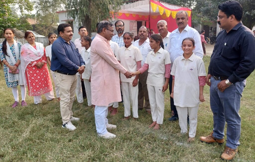 ब्लाक स्तरीय खेल प्रतियोगिता में खिलाड़ियों से परिचय प्राप्त करते जिला अध्यक्ष आनंद पाठक व मंत्री विजय कुमार उपाध्याय