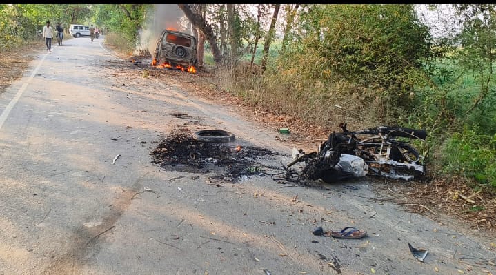आक्रोशित भीड़ ने घटना करने वाले वाहनों में आग लगा दी घंटों धू धू कर जलती रही एस यू बी बोलेरो