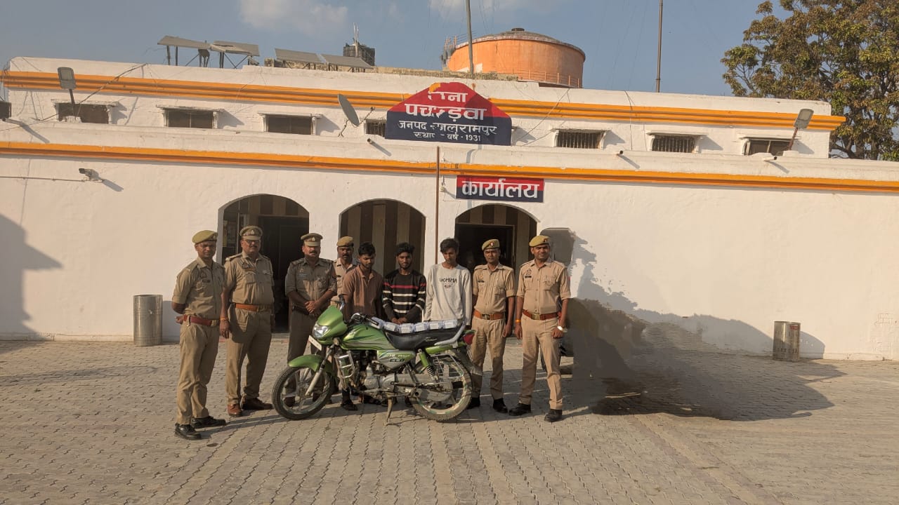 बलरामपुर,दिनांक-20.03.2025 को वादी अंसारुल आलम निवासी थाना चनपटिया जिला पश्चिमी चंपारण बिहार राज्य द्वारा थाना पचपेड़वा पर दिए गए प्रार्थना पत्र में बताया गया कि मैं विजयनगर डिग्री कॉलेज से पचपेड़वा रेलवे स्टेशन पैदल जा रहा था कि रास्ते में गनेशपुर के पास एच एफ डील्क्स मोटरसाईकिल से आ रहे तीन लोगों से लिफ्ट माँगने पर उन्होनें मुझे बैठा लिया, रमवापुर के पास पुहँचने पर मोटरसाईकिल रोककर मेरे पास से 3500 रुपये व मोबाईल छीन कर भाग गए जिसके संबंध में थाना स्थानीय पर मु0अ0सं0 49/25 धारा 309(4) बीएनएस पंजीकृत किया गया।पुलिस अधीक्षक बलरामपुर विकास कुमार द्वारा उक्त लूट की घटना के अनावरण हेतु दिये गये सख्त निर्देश के क्रम में अपर पुलिस अधीक्षक उत्तरी योगेश कुमार व क्षेत्राधिकारी तुलसीपुर बृजनंदन राय के पर्यवेक्षण में तथा प्रभारी थाना पचपेड़वा के नेतृत्व मे आज दिनांक 22.3.2025 को प्रभारी निरीक्षक सतेंद्र बहादुर सिंह, अतिरिक्त निरीक्षक संतोष कुमार त्रिपाठी, उप निरीक्षक अविनाश कुमार सिंह ,उप निरीक्षक संजय कुमार पांडे ,हेड कांस्टेबल नागेंद्र कुमार चतुर्वेदी, हेड कॉन्स्टेबल अखिलेश कुमार यादव ,कांस्टेबल कमलेश गोंड, कांस्टेबल रवि वर्मा ,कांस्टेबल अरुण कुमार प्रजापति, के साथ संदिग्ध व्यक्ति व वाहनों की चेकिंग के दौरान पचपेड़वा-बढ़नी मार्ग पर थाना पचपेड़वा- बढ़नी बॉर्डर पुल के पास थाना स्थानीय पर पंजीकृत मुकदमा अपराध संख्या 49/2025 धारा 309(4) BNS से संबंधित लुटे गए माल नगद ₹3500 व एंड्राइड मोबाइल वीवो v29 कीमत ₹36000 को अभियुक्त गण शादाब पुत्र शमशुल्ला शाह, महबूब उर्फ बब्बू पुत्र मोमिन खान,लाल मोहम्मद उर्फ मोहम्मद खान उर्फ ललवा उर्फ मोहम्मद खान पुत्र स्वर्गीय बरकतुल्लाह निवासीगढ़ ग्राम च्यूटीअहवा दाखिला रतनपुर थाना गौरा चौराहा जनपद बलरामपुर के कब्जे से बरामद करते हुए उक्त घटना में प्रयुक्त मोटरसाइकिल हीरो एचएफ डीलक्स को कब्जे में लेते हुए अभियुक्तगण के विरुद्ध धारा 317(2)BNS की बढ़ोतरी करते हुए माननीय न्यायालय रवाना किया गया।गिरफ्तार किये अभियुक्तों से गहनता से पूछताछ करने पर बताया कि हम तीनों लोग दोस्त हैं दिनांक 20.03.2025 को हम लोगों ने पचपेड़वा स्टेशन की तरफ जा रहे एक व्यक्ति जोकि बाहरी व्यापारी लग रहा था को लिफ्ट देने के बहाने मोटर साईकिल नं0 यूपी UP47L3409 पर बैठाकर ग्राम रमवापुर मोड़ नहर पटरी से ग्राम रमवापुर डीह के पास सून सान जगह देखकर उसका मोबाईल फोन व 3500/रू0 लूट लिये थे और हम तीनो लोग मोटर साइकिल से मौके से भाग गये थे पैसे को हम तीनो लोगो ने आपस मे बाट लिया था। कल हम लोग मोटर साइकिल से इस मोबाइल को नेपाल मे बेचने के लिए ग्राहक की तलाश मे जा रहे थे।