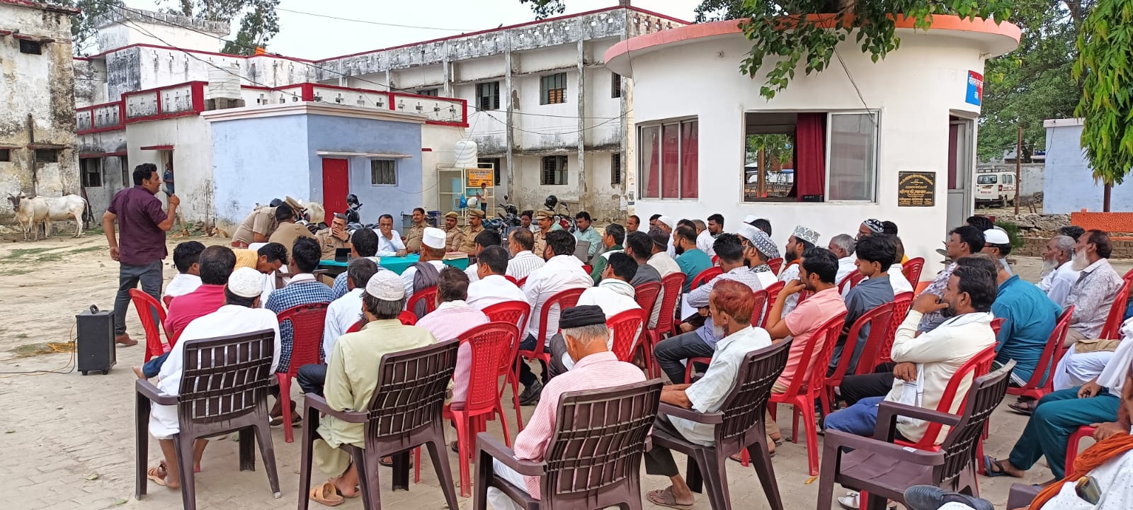 उतरौला, बलरामपुर।आज दिनांक 04.06.2025 को आगामी त्योहार (ईद उल-अज़हा) को शान्ति,सौहार्दपूर्ण सकुशल संपन्न कराने के दृष्टिगत उपजिलाधिकारी उतरौला राजेन्द्र बहादुर सिंह व क्षेत्राधिकारी उतरौला राघवेन्द्र प्रताप सिंह द्वारा थाना कोतवाली उतरौला परिसर में क्षेत्र के सम्भ्रान्त व्यक्तियों,नगर पालिका अध्यक्ष,ग्राम प्रधान,धर्मगुरुओं,डी0जे0 संचालकों एवं ग्राम प्रहरियों के साथ पीस कमेटी बैठक की गई।बैठक में डी0जे0 संचालको को मानक के अनुसार डी0जे0 बजाने व किसी भी प्रकार के अभद्र गाना न बजाने की अपील की गयी तथा सभी जन मानस को त्योहारों को शांतिपूर्वक मनाने तथा अफवाहों पर रोकथाम करने हेतु जागरुक किया गया । आपसी भाईचारा बनाकर त्योहार को सकुशल संपन्न कराने, सोशल मीडिया पर भड़काऊ पोस्ट व टिप्पणी न करने के लिये युवकों को समझाने के लिए बताया गया तथा किसी भी विषम परिस्थिति में तत्काल डायल112/ थाना स्थानीय पर सूचना देने व शासन द्वारा प्राप्त दिशा-निर्देशो के अनुपालन कराने एवं त्योहारो को सकुशल सम्पन्न कराने के लिये शान्ति पूर्वक रूप से त्यौहार मनाने के लिये अपील किया गया। इस अवसर पर प्रभारी निरीक्षक थाना कोतवाली उतरौला अवधेश राज सिंह व अन्य अधिकारी, कर्मचारीगण व संभ्रांत व्यक्ति उपस्थित रहे।