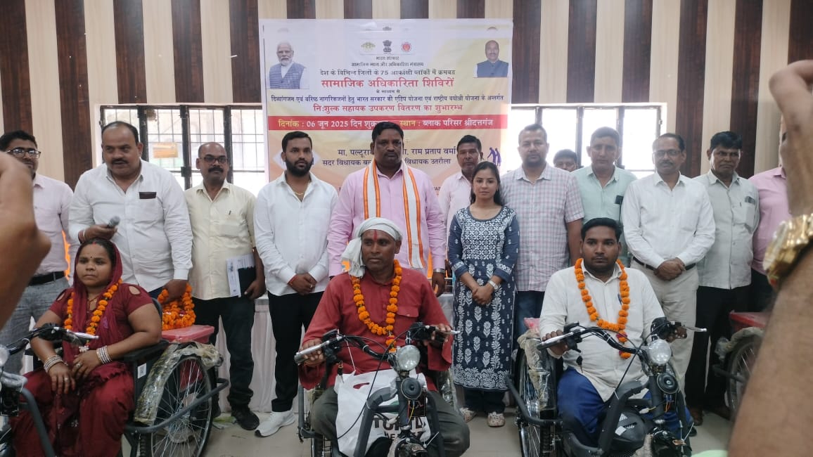 श्रीदत्तगंज, बलरामपुर।आकांक्षी विकास खंड श्रीदत्तगंज में राष्ट्रीय व्योश्री योजना के तहत विकास खंड सभागार में एलिमको कानपुर और जिला प्रशासन के सहयोग से दिव्यांजनो को निशुल्क सहायक उपकरण कार्यक्रम में मुख्य अतिथि विधायक सदर पल्टूराम द्वारा 46 दिव्यांगजनों को 80 से अधिक उपकरण वितरित किए गए , जिसमें 20 मोटराइज्ड ट्राइसाइकिल भी शामिल है।मोटराइज्ड ट्राइसाइकिल एवं सहायक उपकरण पाकर सभी दिव्यांगजन के चेहरे खुशी से खिल उठें।इस अवसर पर विधायक बलरामपुर सदर पल्टूराम ने कहा कि प्रदेश के यशस्वी मुख्यमंत्री के मार्गदर्शन में प्रदेश सरकार द्वारा दिव्यांगजन सशक्तिकरण के कई योजनाएं चलाई जा रही हैं एवं लाभान्वित किया किया जा रहा हैं।इस अवसर पर बीडीओ श्रीदत्तगंज , जिला दिव्यांगजन सशक्तिकरण अधिकारी व मण्डल अध्यक्ष त्रिगुणायत, मण्डल अध्यक्ष सुरेश त्रिपाठी, घनश्याम तिवारी, आकाश पाण्डेय व अन्य संबंधित अधिकारी,कर्मचारीगण उपस्थित रहें।