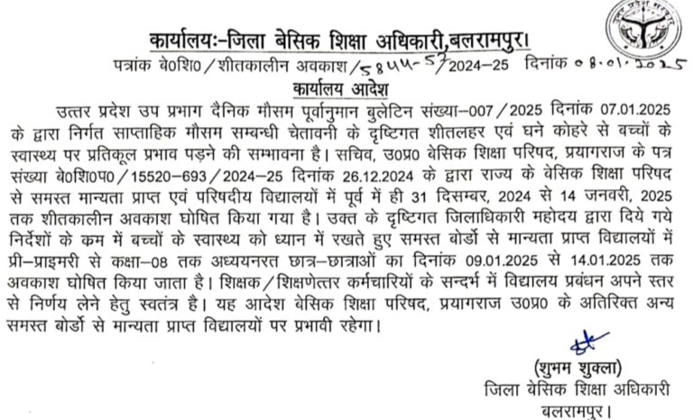 ब्यूरो बलरामपुर समस्त बोर्डो के विद्यालयों में लागू - जिलाधिकारी बलरामपुर।उत्तर प्रदेश उप भाग दैनिक मौसम पूर्वानुसार निर्गत मौसम चेतावनी...